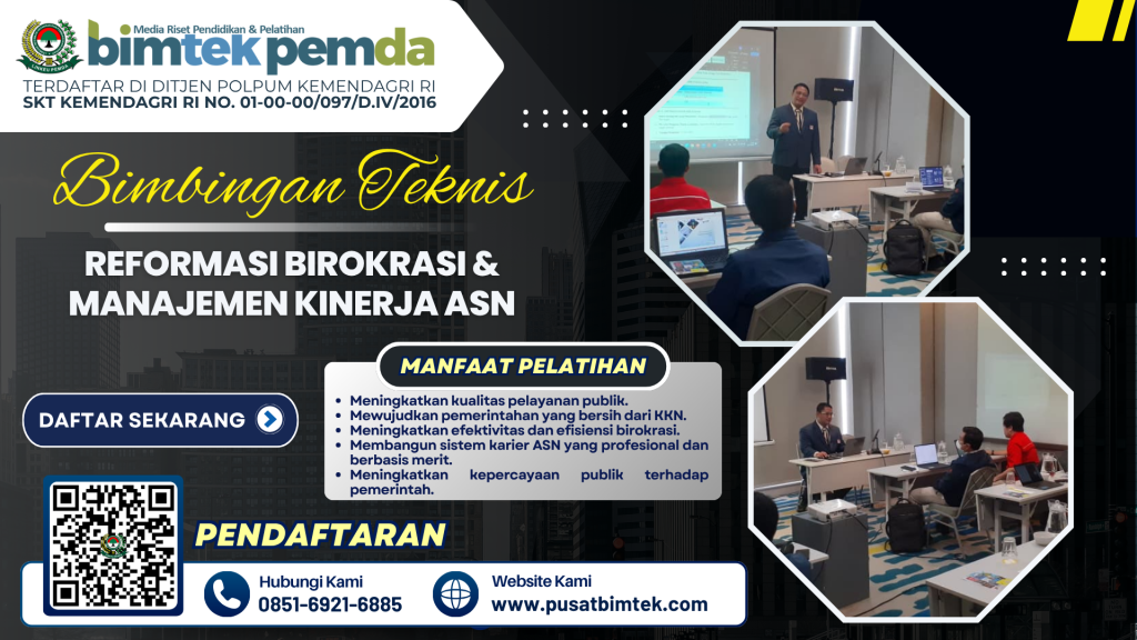 Reformasi birokrasi merupakan salah satu agenda besar pemerintah Indonesia dalam mewujudkan tata kelola pemerintahan yang bersih, transparan, akuntabel, dan berorientasi pada pelayanan publik. Aparatur Sipil Negara (ASN) sebagai motor penggerak birokrasi dituntut memiliki kompetensi, integritas, dan kinerja yang optimal agar mampu memberikan pelayanan terbaik kepada masyarakat. Bimbingan Teknis (...